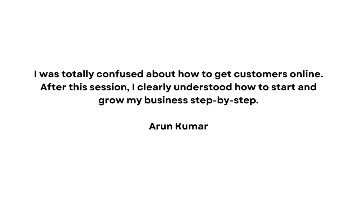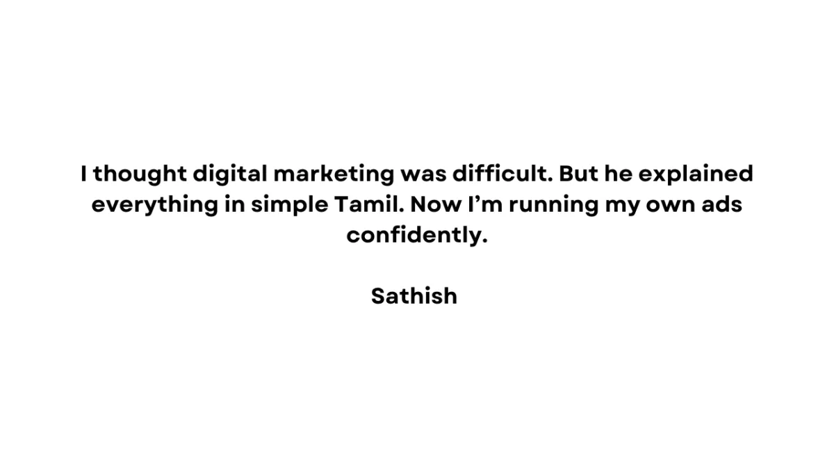 நான் 500க்கும் மேற்பட்ட வியாபாரிகள், ஃப்ரீலான்சர்கள் மற்றும் தொழில்முனைவோர்களுக்கு மேட்டா Ads மற்றும் லீடு ஜெனரேஷன் குறித்த பயிற்சி அளித்துள்ளேன்.எனது நோக்கம், சிறு மற்றும் நடுத்தர வியாபாரிகள் விளம்பரங்களில் தேவையற்ற செலவுகளை தவிர்த்து, நிரந்தரமாக வாடிக்கையாளர்களை அடைய உதவுவதாகும்.இந்த Webinar-ல் நான் பகிர்வது உங்கள் வியாபாரத்தை 10 மடங்கு வளர்க்கும் சுவையான ரகசியங்கள் மற்றும் செயல்படக்கூடிய வழிகள் ஆகும்.நேரடி அனுபவங்களையும், எளிய மற்றும் விளக்கமான அறிவுரைகளையும் வழங்கி, நீங்கள் டிஜிட்டல் மார்க்கெட்டிங்கை முழுமையாக பயன்படுத்தி வெற்றியை அடைய உதவுவேன்.